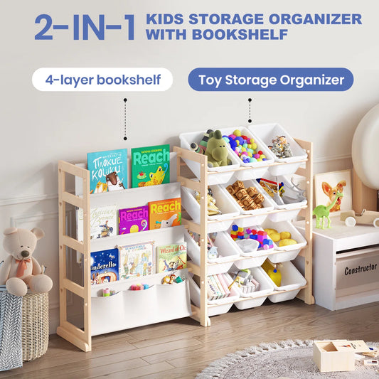 Kids Toy Storage Unit – 2-in-1 Bookshelf & Organiser with 12 Bins and 4-Tier Rack