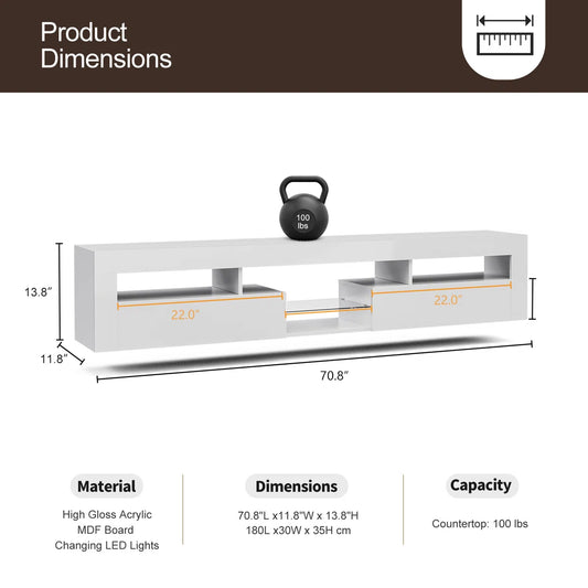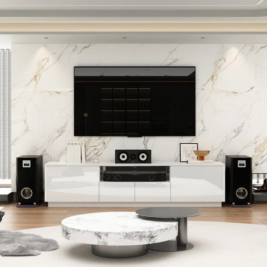 tv panel: 85" wall-mounted entertainment center, high-gloss white with LED and storage