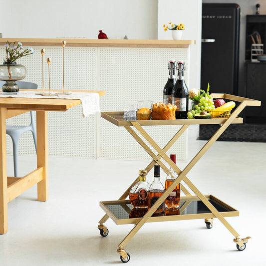 Some bar trolley is available in folding. But gold bar cart not look lovely in folding. A wheel of gold bar cart is also available in gold color.