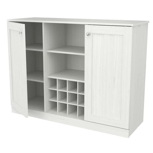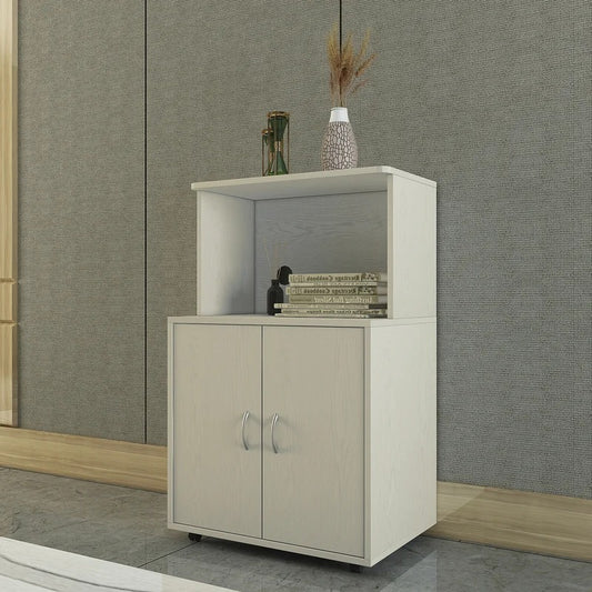 It is made of engineered wood with melamine veneer and has a neutral white finish for a versatile accent to any kitchen home décor. It has a single cabinet with two doors that a open to reveal two central shelves.