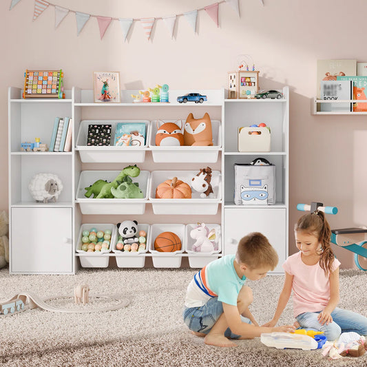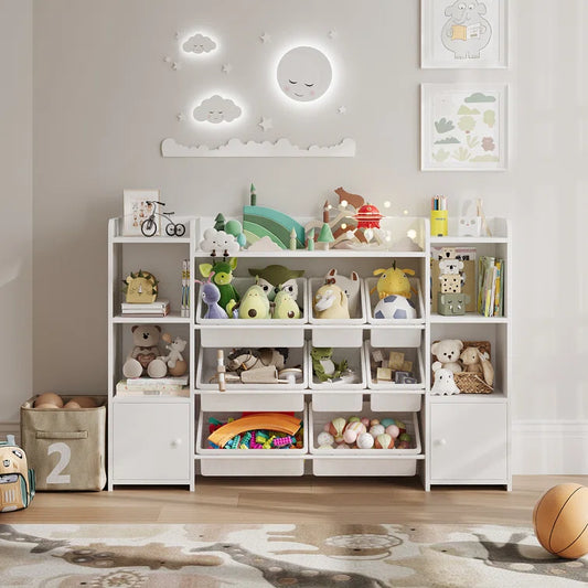 Kids Toy Storage Unit: 55.7" Wide Multi-Bin Organiser with Book Shelves & Cabinets