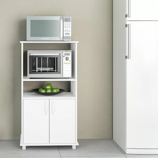 It is made of engineered wood with melamine veneer and has a neutral white finish for a versatile accent to any kitchen home décor. It has a single cabinet with two doors that a open to reveal two central shelves.