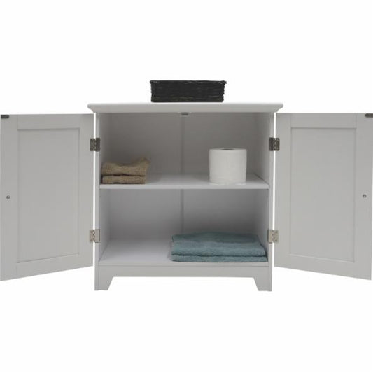 It is made of engineered wood with melamine veneer and has a neutral white finish for a versatile accent to any kitchen home décor. It has a single cabinet with two doors that a open to reveal two central shelves.