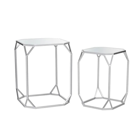Many glass coffee table Design come with silver finish. You want silver finish coffee table Design then buy Glass Sled Nesting Tables. This is come with glass top and silver shining.
