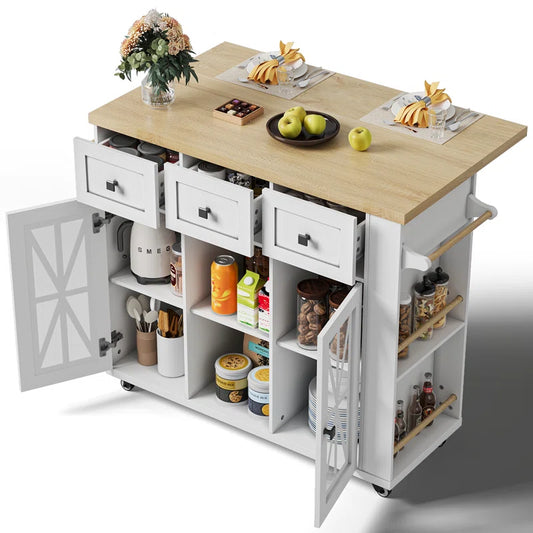 Kitchen Island Table: White Base Drop-Leaf Island with Storage & Light Wood Countertop