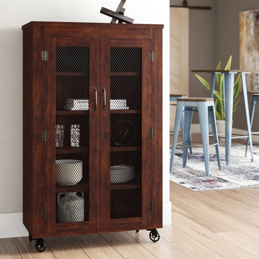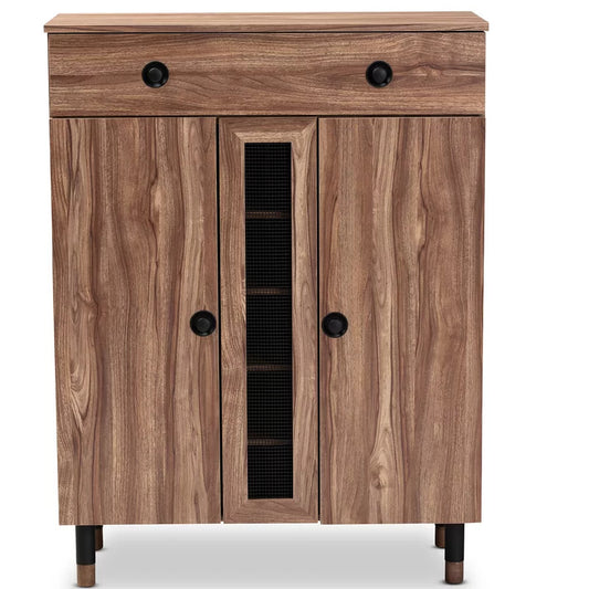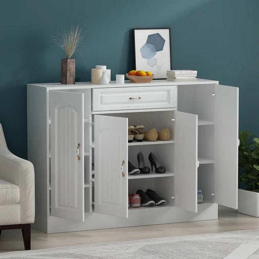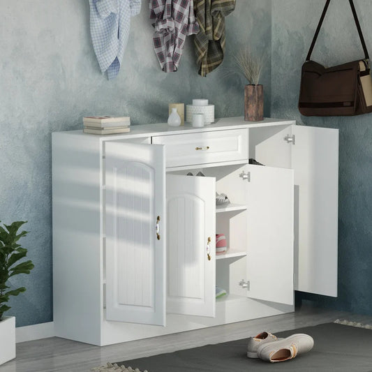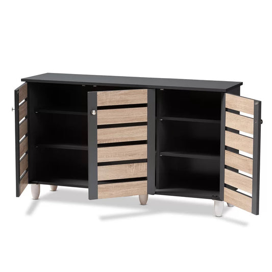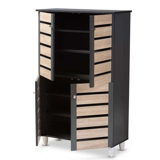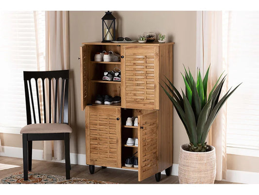 Shoe Rack: Oak Brown Finished Wood 4-Door Shoe Storage Cabinet