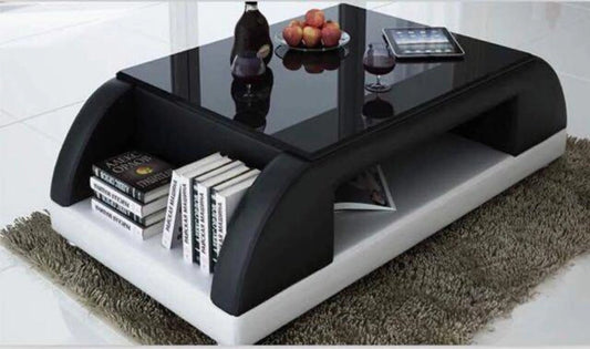 Leatherette Coffee Table: Black and White Leatherette Coffee Table w/Black Glass