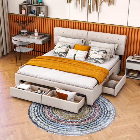 Divan Bed: Linen Upholstered Platform Bed with 4 Drawers
