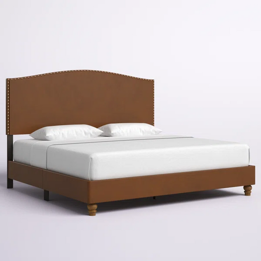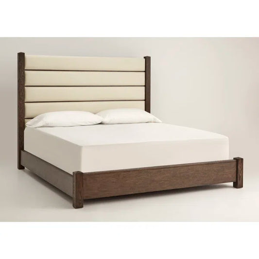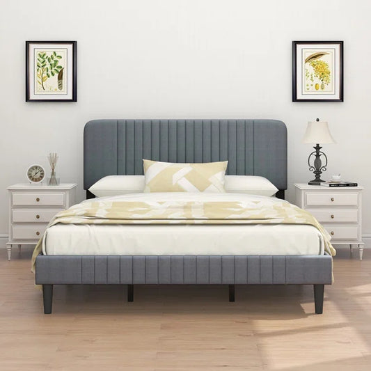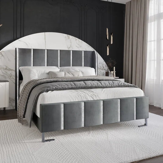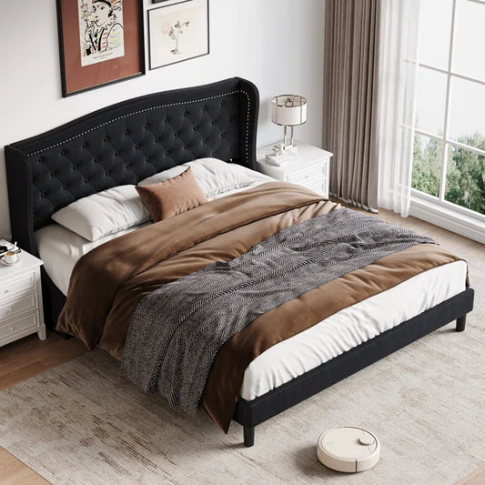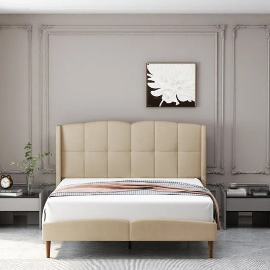 Queen Size Bed: Fabric Upholstered Bed with Wingback Design