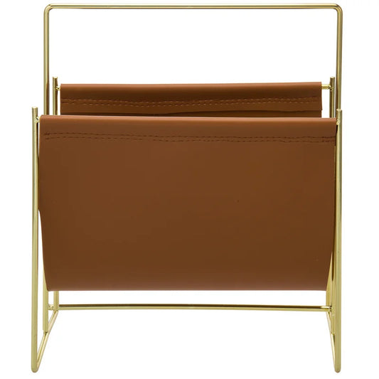 The magazine holder made with leather-based and metal legs offers this piece a contemporary-day.