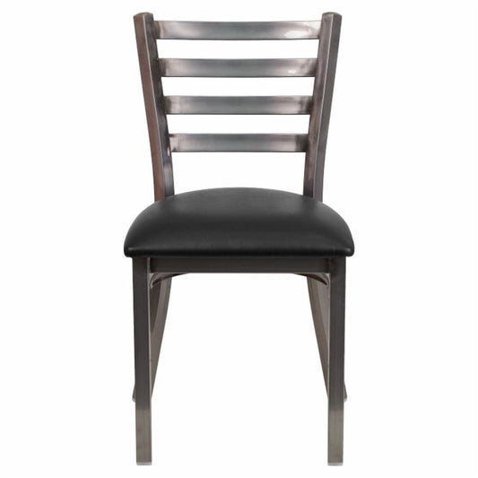 Cafe Chair: 19.5 in. Clear Coated Metal and Vinyl Ladder Back Restaurant Chair