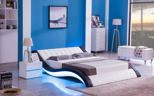 Queen Size: Black & White Leatherette Queen Size Smart Bed with LED Light