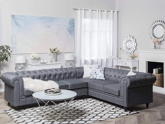 L Shape Sofa Set:- Chesterfield Fabric Sofa Set (Light Grey)