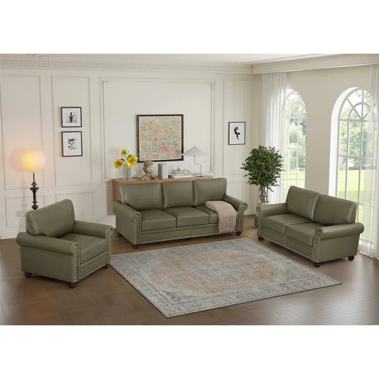 7 Seater Sofa Set: 85.83" Genuine Green Leather 3-Piece Living Room Set