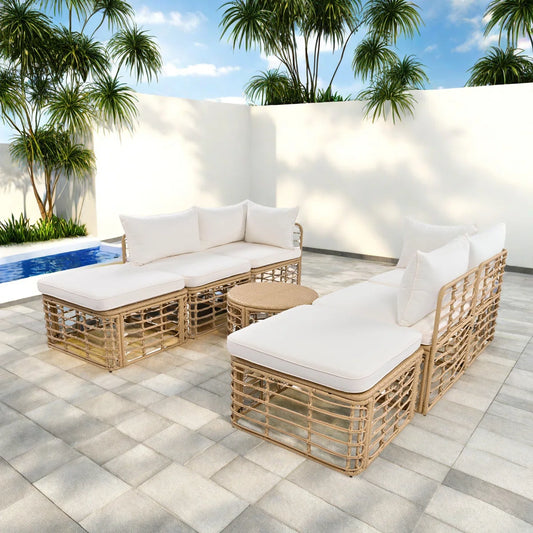 7 Seater Sofa Set: Outdoor Rattan 7-Piece Sectional with 6 Seats, Round Coffee Table & Pillows