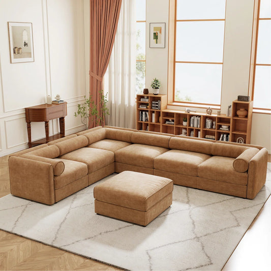 7 Seater Sofa Set: Modern 6-Piece Modular Sectional with Storage in Camel Chenille