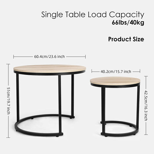 Nest Of Tables: Set of 2 for Living Room, Balcony, Garden, Round Table with Wood Side, Sturdy Metal Frame