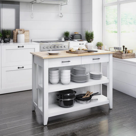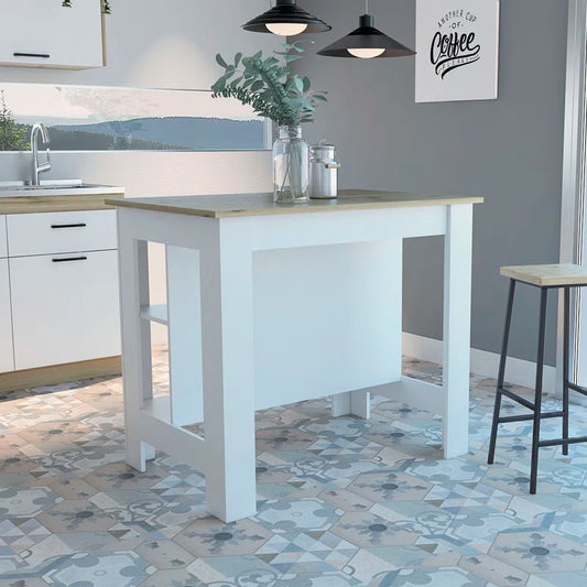 Kitchen Island Table: Two-Tone Workstation with Storage Shelves & Seating Space