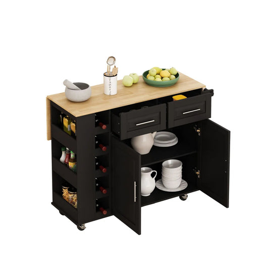 Kitchen Island Table: 44.5” Solid Wood Rolling Cart with Drop Leaf, Drawers, Cabinets & Towel Racks