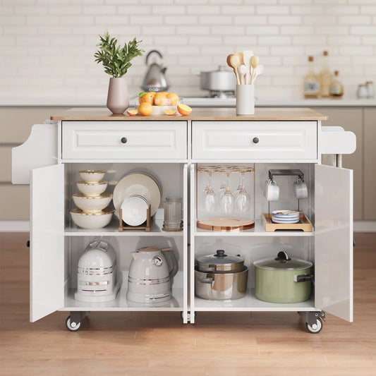 Kitchen Island Table with Solid Wood Countertop, Storage Cabinets & Casters – 52-Inch Classic Design
