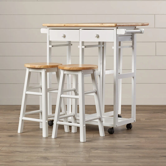 Kitchen Island Table: 32'' Wide White Solid Wood 3-Piece Set with Drop Leaf & Stools