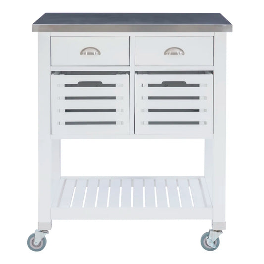 Kitchen Island Table: 30'' Wide Rolling Grey Cart with Stainless Steel Top, Storage Drawers & Bins