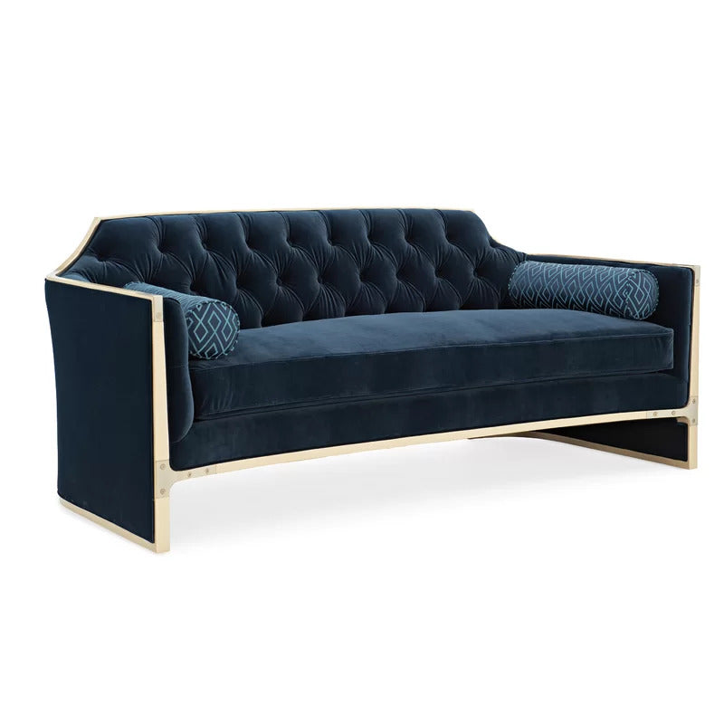 It's never been easier to embrace fashion-forward style in a big way than with this stunning 4 Seater Sofa Set. Designed to be a topic of conversation and destined to be where everyone wants to sit, its bold presence is iconic and inviting. Dressed in a sumptuous midnight blue velvet as intriguing as the night sky, this statement piece features a tufted back, bench cushion, and two coordinating bolster pillows. It's trimmed in Warm Silver paint with Champagne Gold brackets that lend another layer of luxury-rendering it the cat's meow.