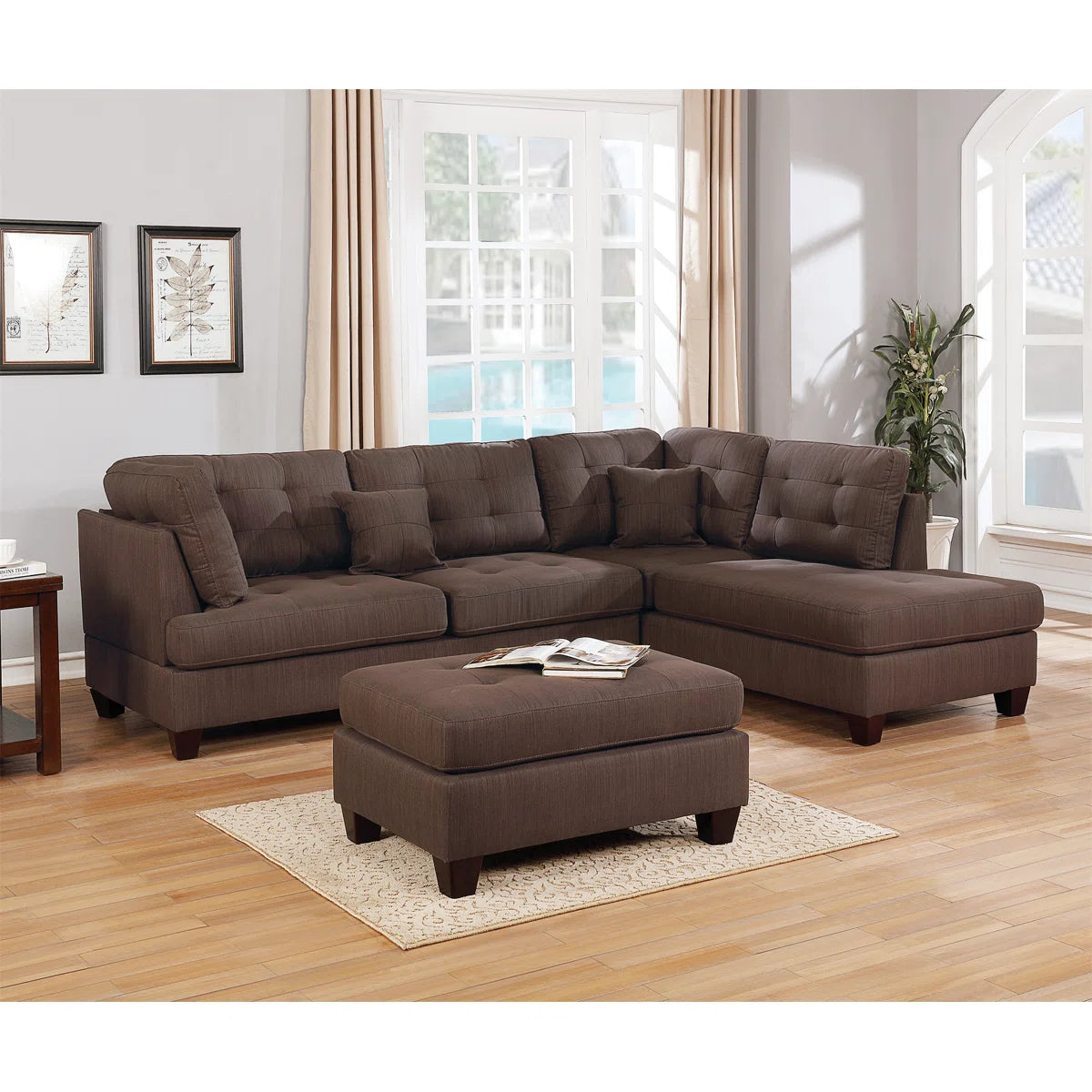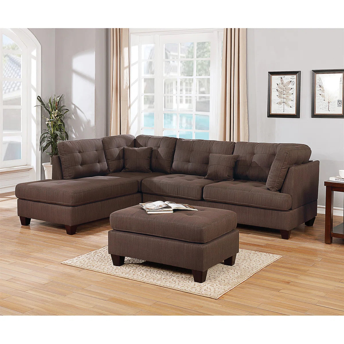 This stylish seven-seater a couch put will add style to your living area. It includes a three-piece sectional seat with a reusable chaise and matching ottoman in a stylish black coffee fabric. With its roomy seating and cozy, open design, this set is great for gatherings or families. The soft fabric adds a cozy, approving touch with, and the reusable chaise makes it simple for changes to your room's layout. An savvy and modern solution for any current living area.