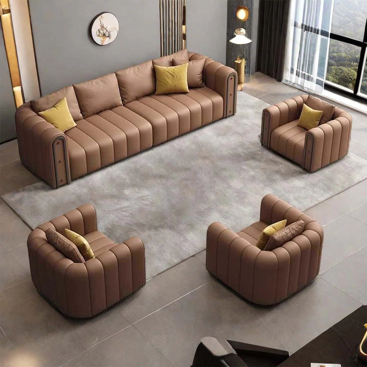 This wonderful 4-piece faux leather living room set, which has been designed as a complete 7-seater sofa set, will give your living area a stylish, modern an update. With its roomy three-seater sofa, loveseat, and two single-seaters, this set offers loads of seating for families or visitors, making it perfect for relaxing as well as everyday relaxation. This seven-seater sofa set, which is made of reliable the manner leather, provides the luxurious look and feel that comes from real leather without a lot of service. As the seat covers and lined seats provide durable support and comfort, the smooth surface allows for cleaning simple. This faux leather seven-seater sofa set's trendy design, attached details, and basic shades work in well with a range of interior design fashion, from typical and the transition to basic and the city.