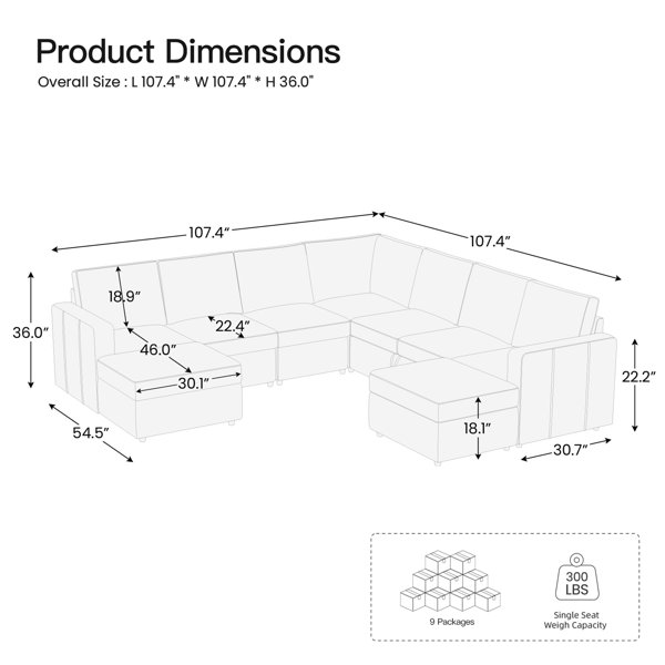 7 Seater Sofa Set: L-Shaped 107” Wide Modular Sectional Couch