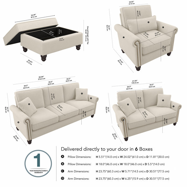 - Included in the set are an 85-inch sofa, a 61-inch loveseat, an armchair accent chair, a storage ottoman, four pillows, and a back pillow.