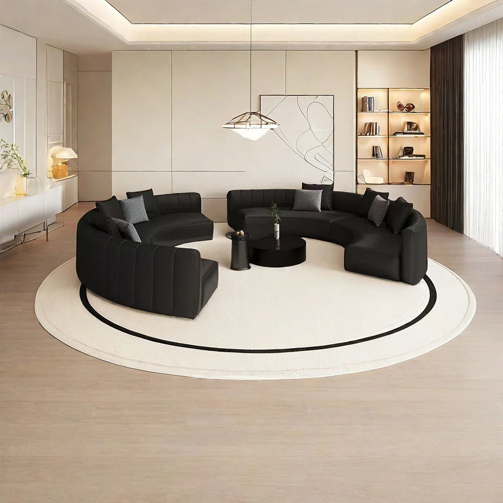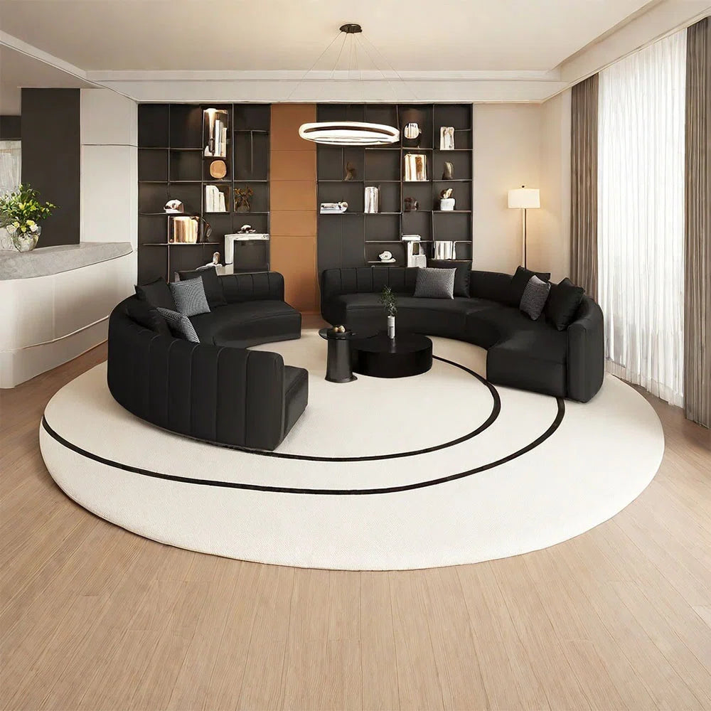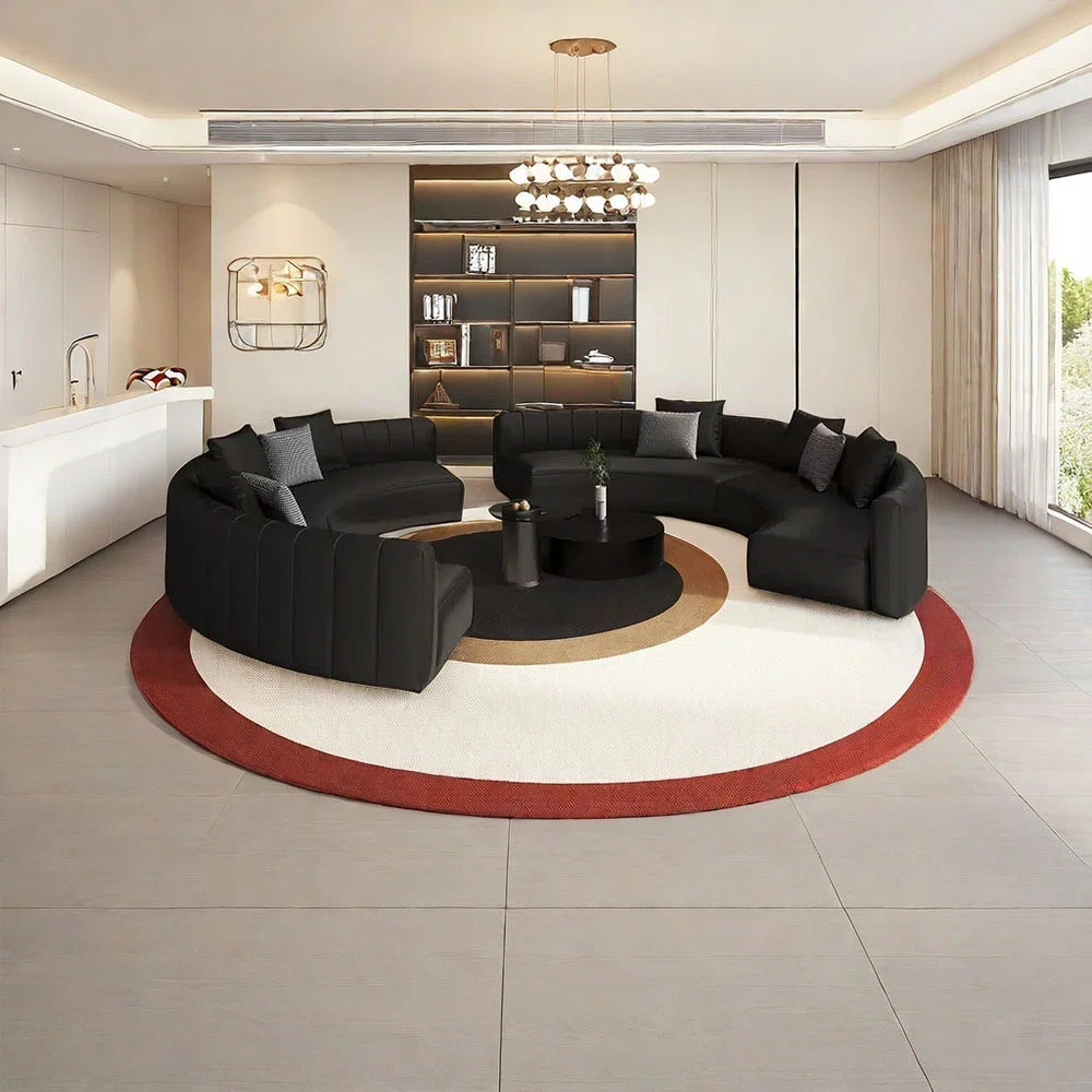 This stylish seven-seater sofa set, that has an impressive semi-circular arc shape for easy conversations and stylish comfort, will make an impact in your office or living area. This settling sofa, which is covered in a stylish black fabric or leather-like, is ideal for offices, resort ask areas, or modern homes where luxury and practicality overlap. This seven-seater sofa set, made for group seating, has a going, curves form promoting discussion and enhances the look of any space. Up to seven people can sit comfortably in the large seating area, and the high-density foam soft cushions offers all-day comfort.