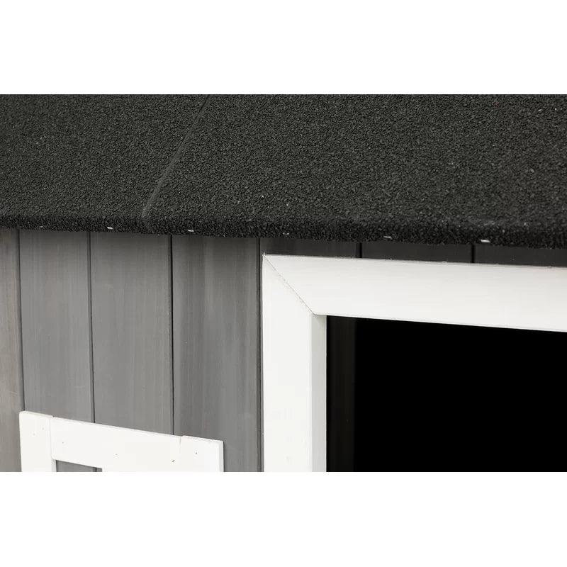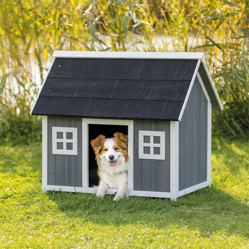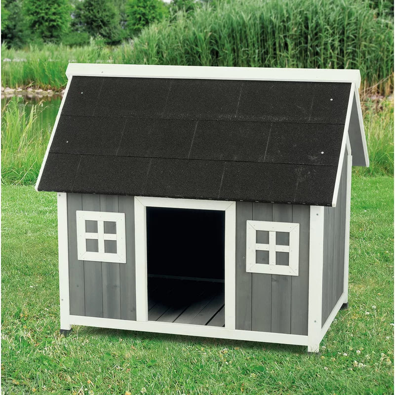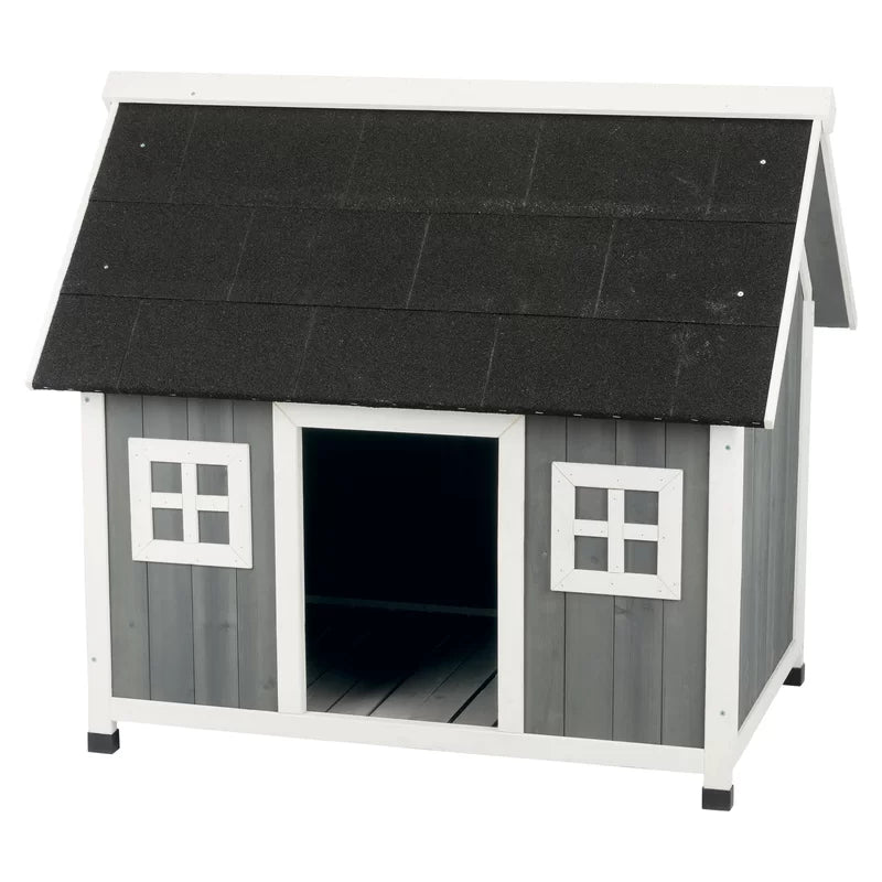 This wooden dog shelter braves the elements while remaining stylish with weatherproof solid fir construction. The raised floor and tongue-and-groove exterior protect your furry friend from chilling wind drafts. The gable style roof allows water to drain and is covered with a heavy-duty mineral roofing felt for greater protection against mother nature.