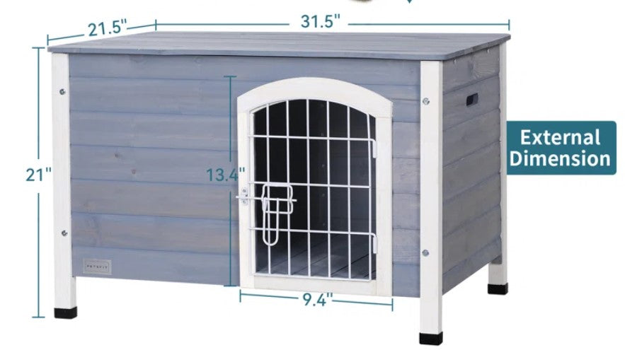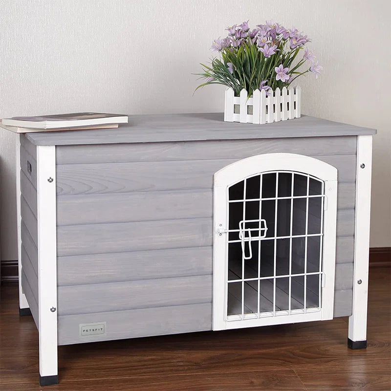 This gray wood dog kennel is designed for both durability and style. It keeps your pet safe from the elements while providing a comfortable resting area. Its attractive appearance makes it a wonderful addition to your home, ensuring your dog has a cozy place to call their own!