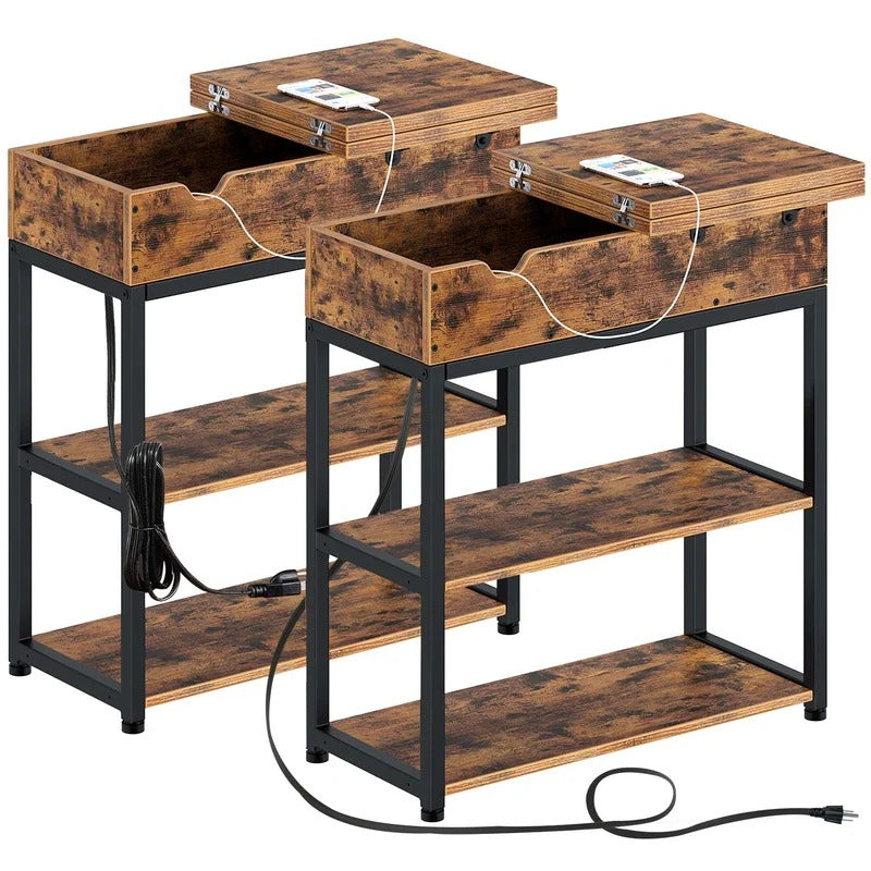 This rustic brown end table is both functional and stylish. The built-in outlets and storage make it ideal for modern living, offering a convenient charging station and space to store essentials. A great addition to living rooms or bedrooms for added convenience.