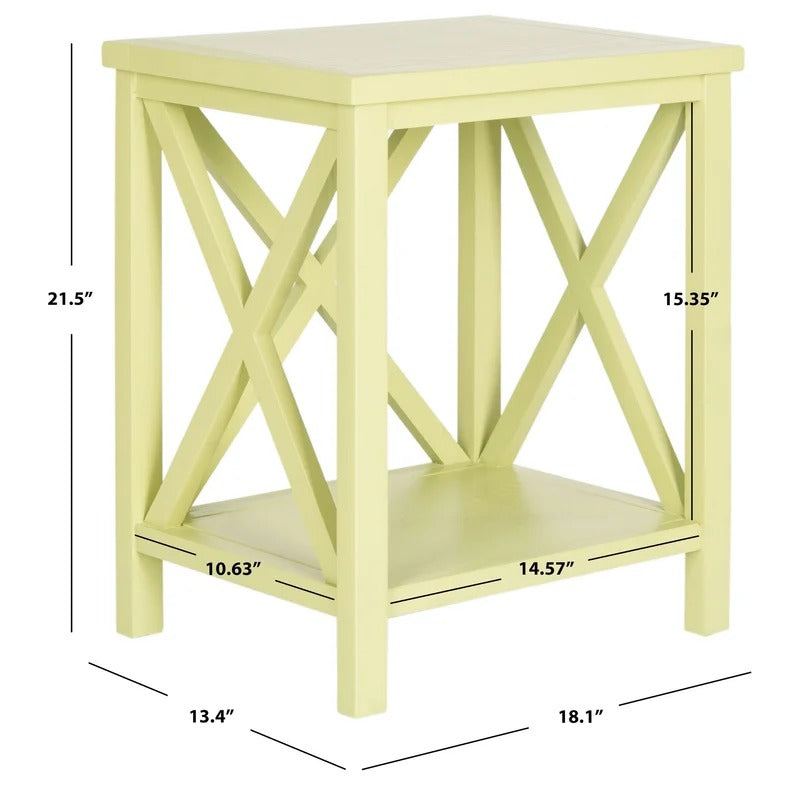 Add architectural interest to your interior with this end table. The open X detailing on the frame brings a touch of country charm, and a lower shelf provides space for storage and display. Perfect for use in pairs to frame a sofa or loveseat.