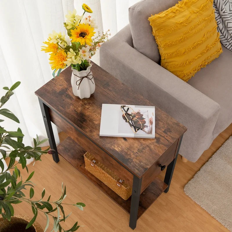 - Retro Industrial Style: The industrial look of the black iron frame is complemented by the rustic top of the side table for an exciting mix of styles. This charming side table is a decorative element in the home and works in all rooms at the same time.