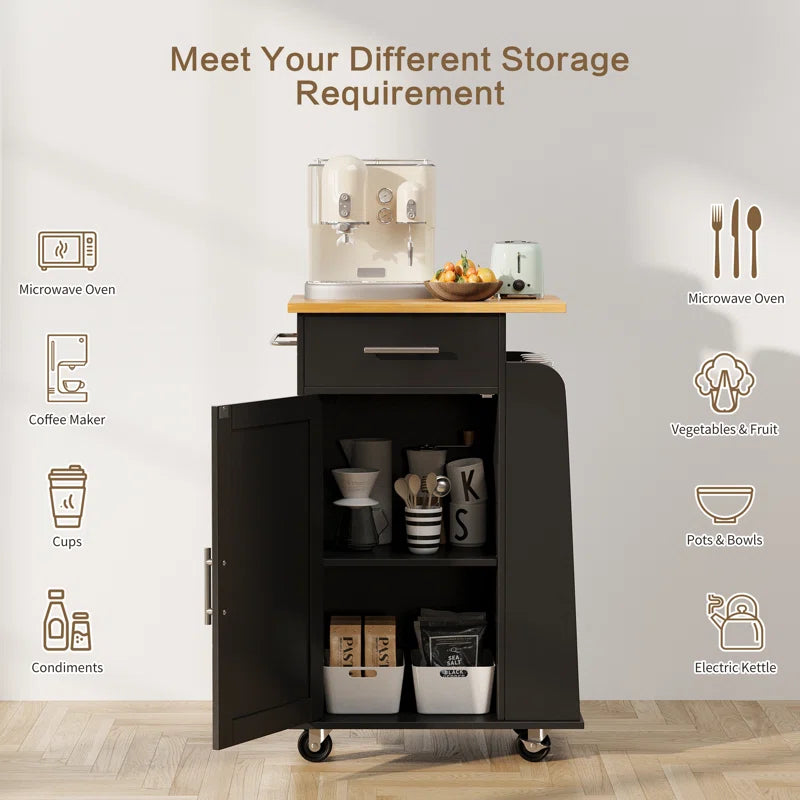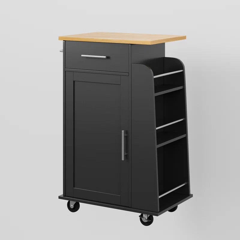 This kitchen island table is a compact yet functional solution for small kitchens or dining areas. Built with a solid wood countertop supported by an engineered wood frame, it includes a storage drawer, adjustable interior shelves, and a built-in towel rack. Four caster wheels provide easy mobility, with two locking for added stability. Its water- and scratch-resistant finish ensures long-term use with minimal upkeep, making it ideal for versatile home use.