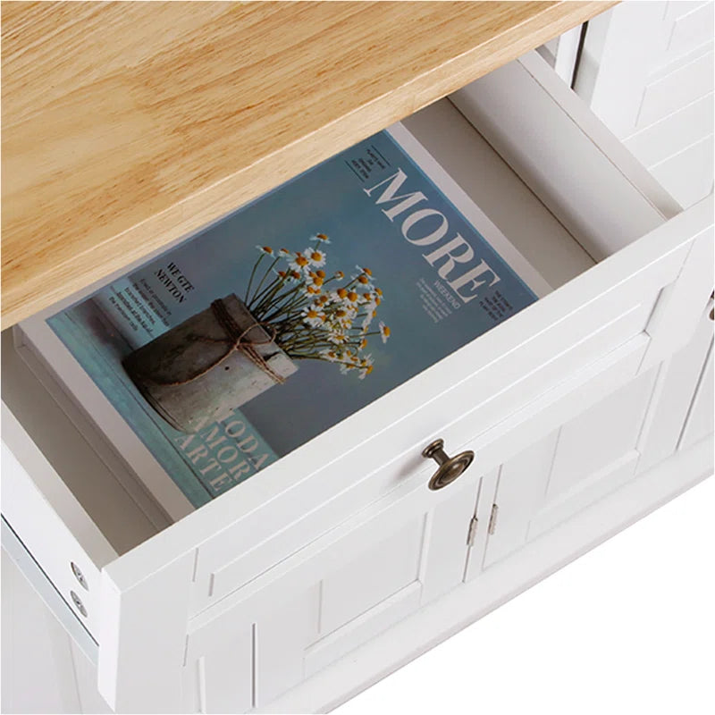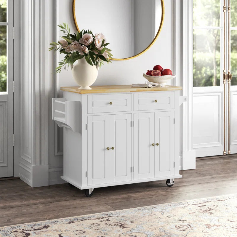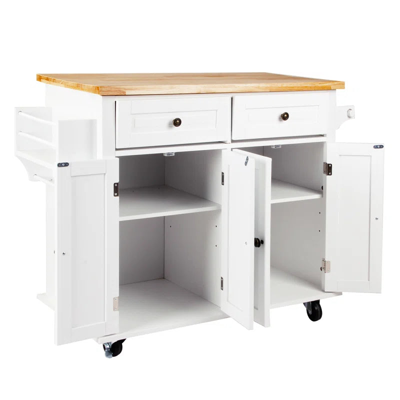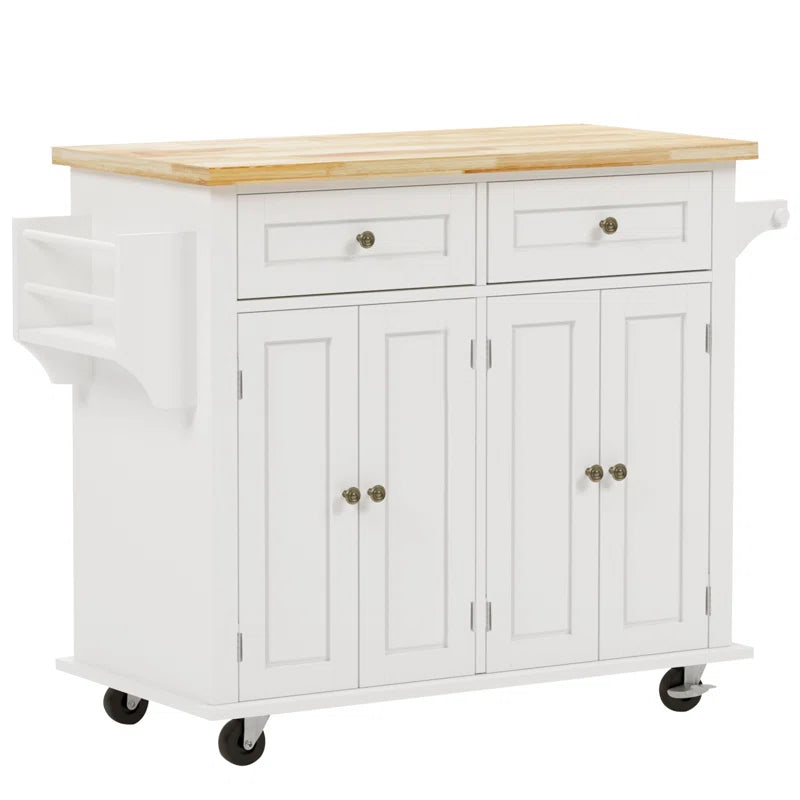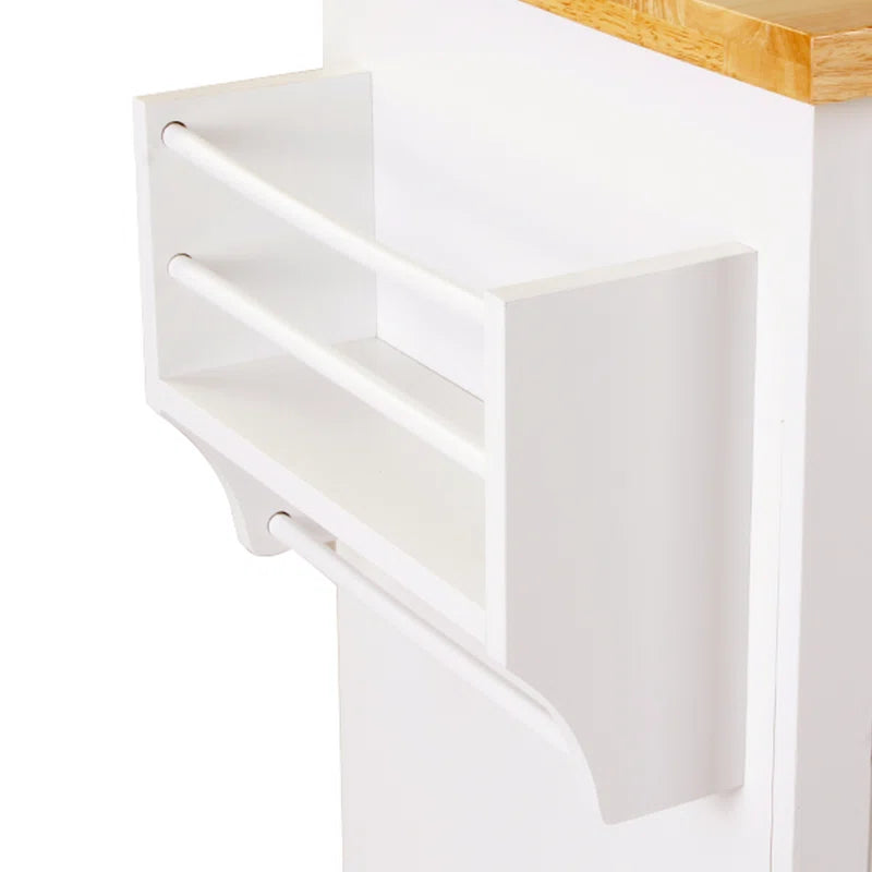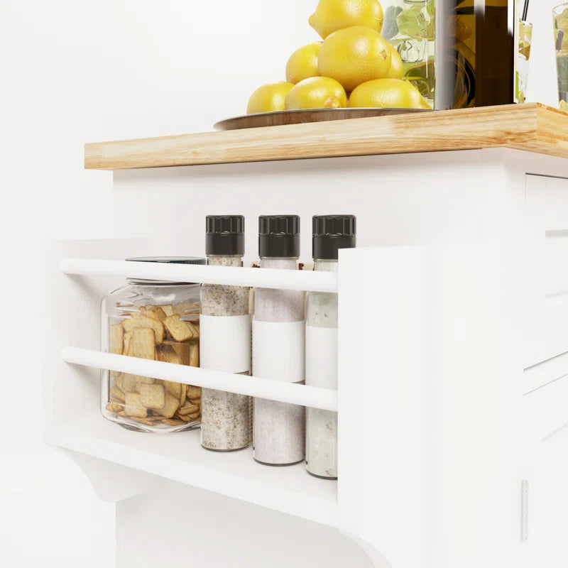 Add charm and utility to your kitchen with this French-country-inspired kitchen cart by Kelly Clarkson. Made from solid and engineered wood, it features a smooth brown countertop and a crisp white base. With two drawers, two cabinets, a towel rod, and a built-in spice rack, this cart offers practical storage and style. Lockable caster wheels ensure easy mobility, making it a functional and beautiful centrepiece for your kitchen.
