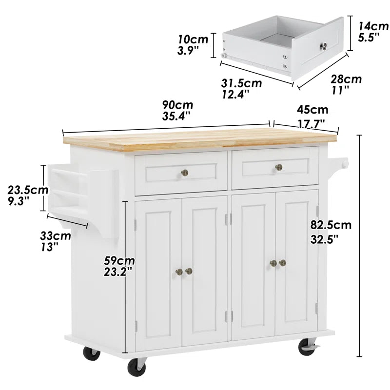 Kitchen Island Table: 35.4’’ wide White Kitchen Cart with Solid Wood Top & Storage Cabinets