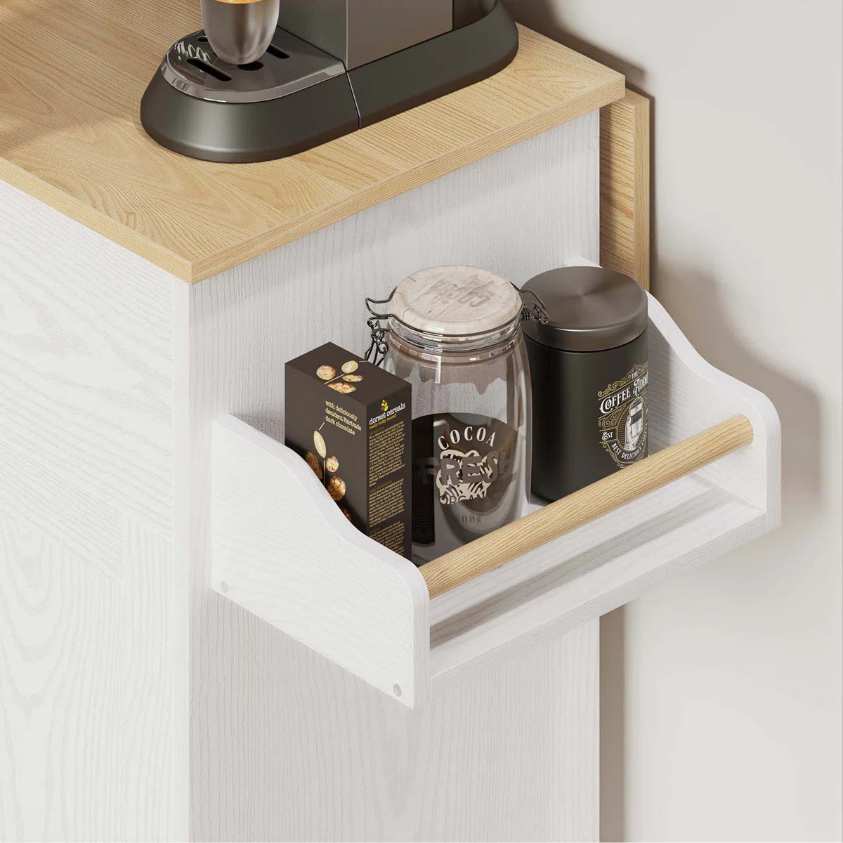 - Ample Storage Space: Hidden cabinets, spacious drawers, spice and towel racks, ideal for storing utensils, cookware, and small appliances.