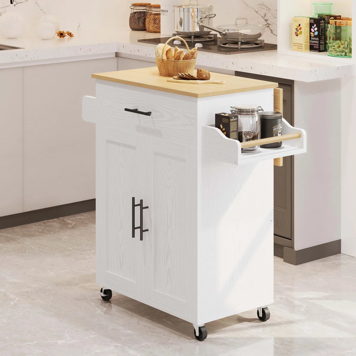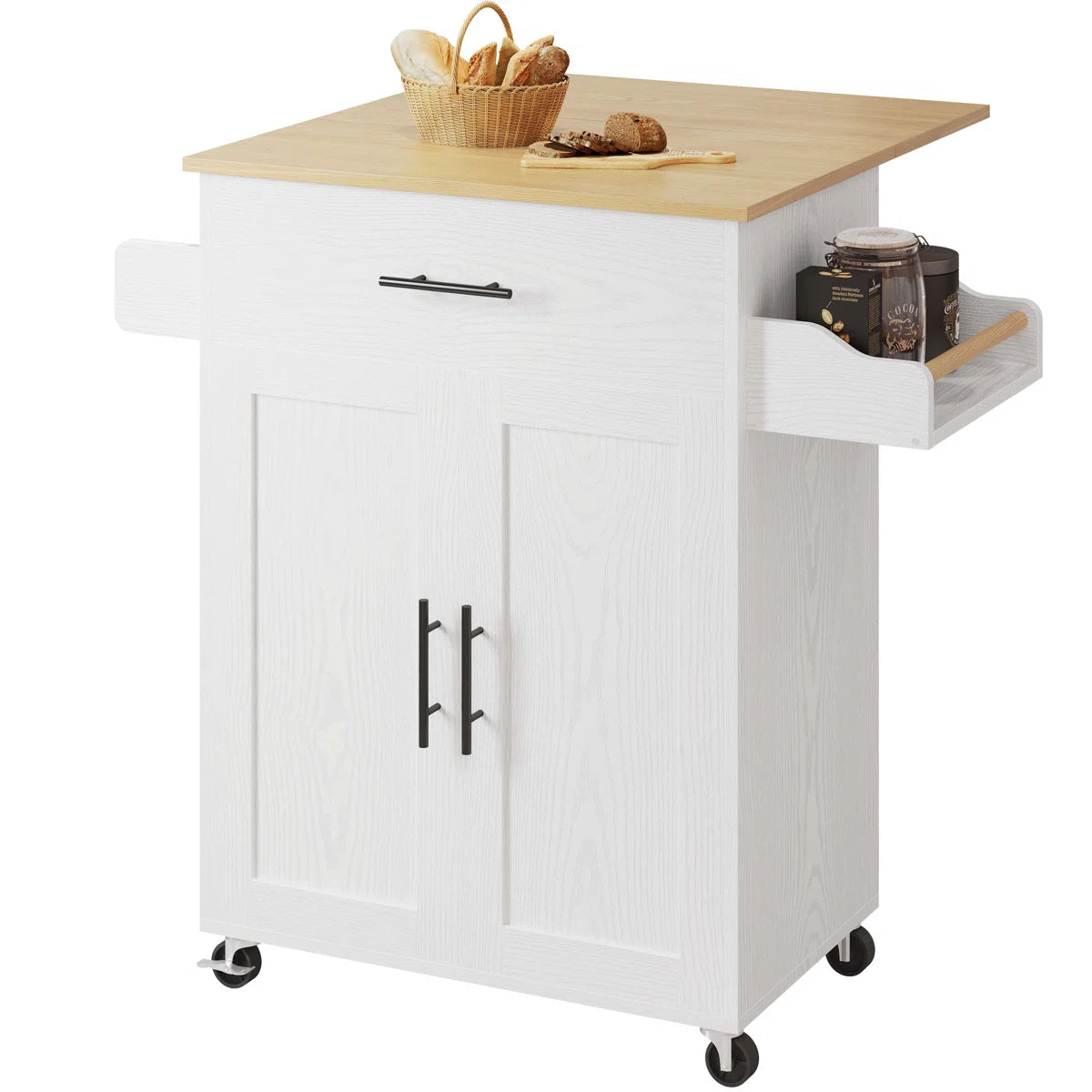Looking for a flexible and stylish storage solution for your kitchen? This kitchen island table blends modern functionality with a classic look. Designed with a vertical build for maximum storage in a small footprint, it includes foldable countertop space, adjustable shelves, drawers, cabinets, and spice and towel racks. The smooth-rolling wheels allow easy movement, while two locking casters ensure stability. Perfect as a kitchen prep station, dining bar, microwave cart, or mobile storage unit.