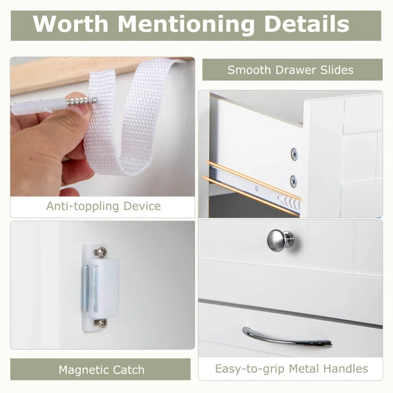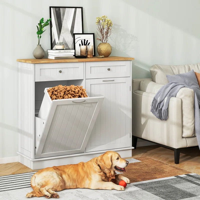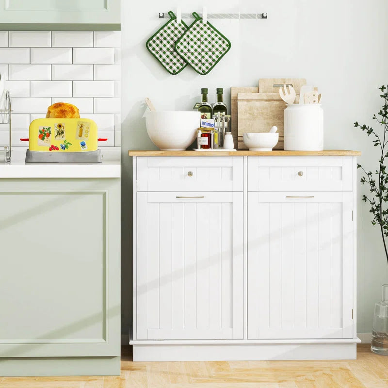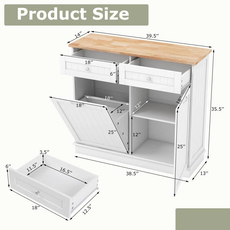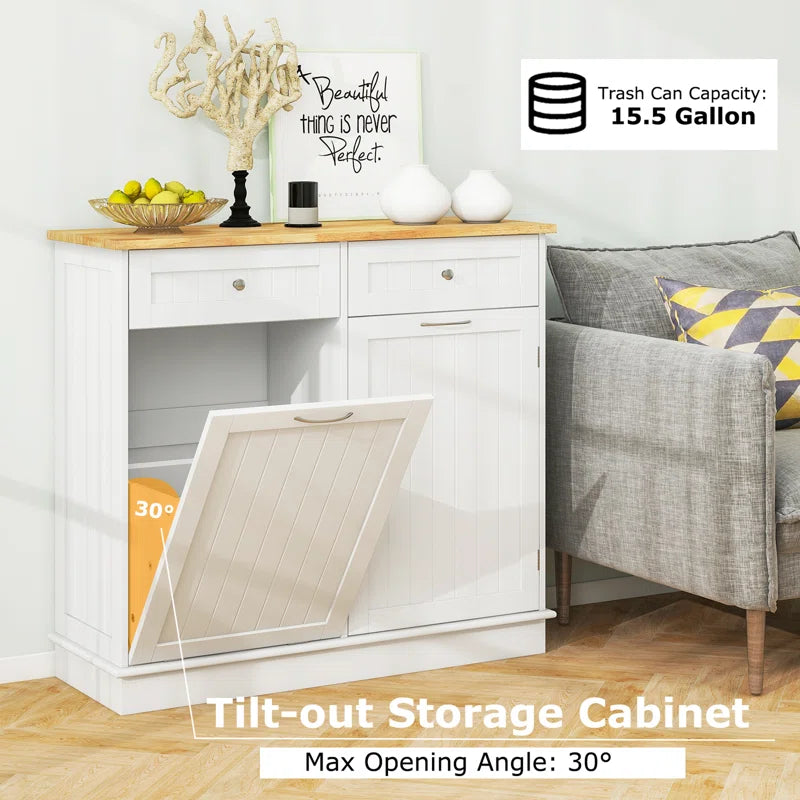 Say goodbye to kitchen clutter and unpleasant odours with this multifunctional tilt-out trash cabinet. Designed with a hidden 15.5-gallon garbage holder, spacious drawers, and a side cabinet with an adjustable shelf, it keeps your kitchen organised and odor-free. The sturdy MDF and rubber wood top ensure long-lasting durability. With elegant design and anti-toppling features, it's a smart addition to any kitchen, laundry, or utility room.
