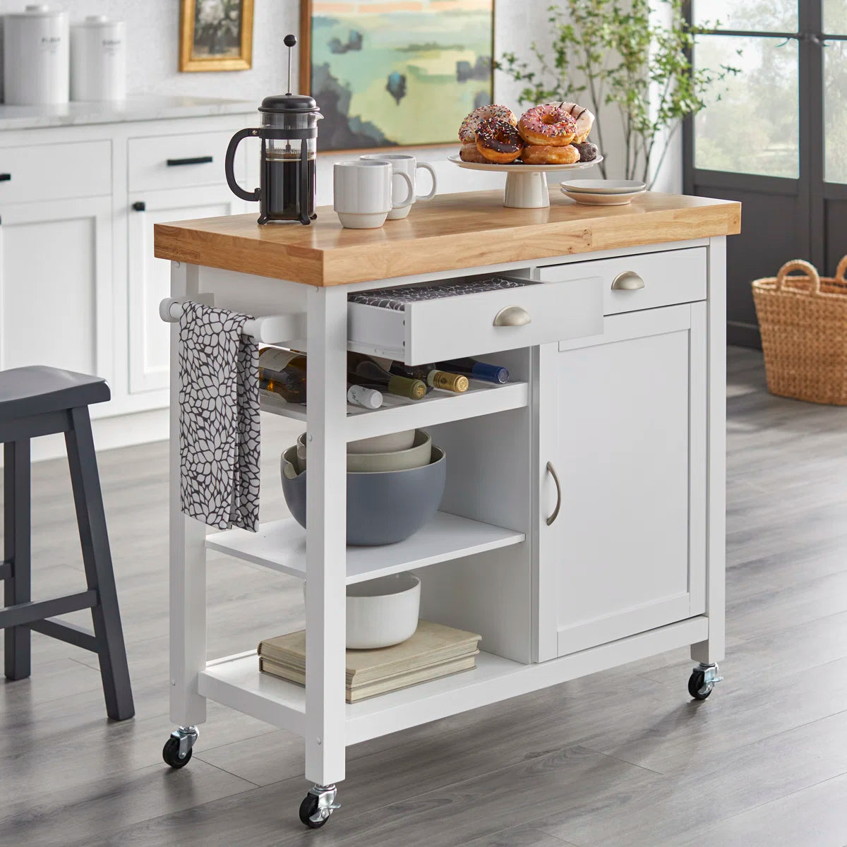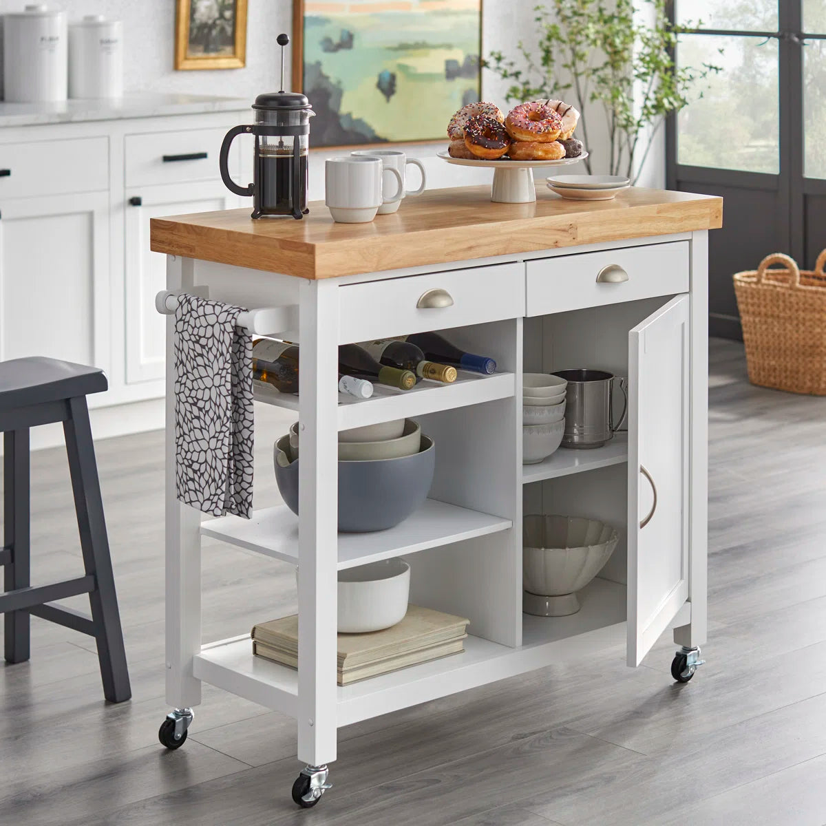 Kitchen Island Table: 41.5" Wide Multi-Storage Rubberwood Cart with Wine Rack & Towel Bar