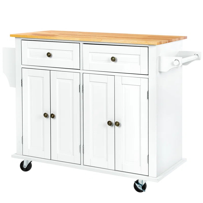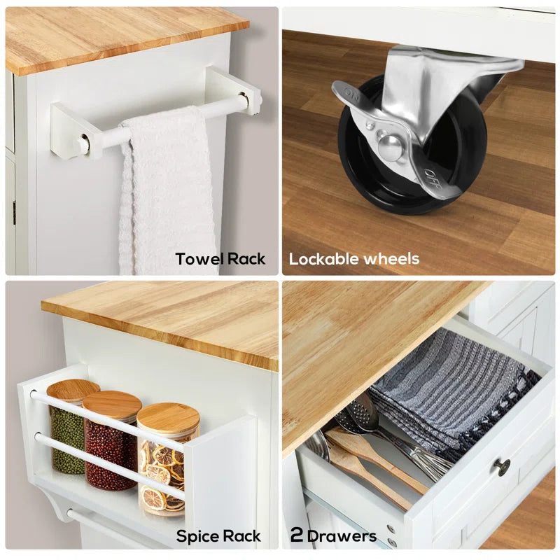 - Generous Storage: With a large solid wood top, two spacious cabinets, two drawers with smooth gliding action, a spice rack, and a removable towel rack, this kitchen island offers ample storage. The drawers are ideal for napkins, cutlery, and other items.