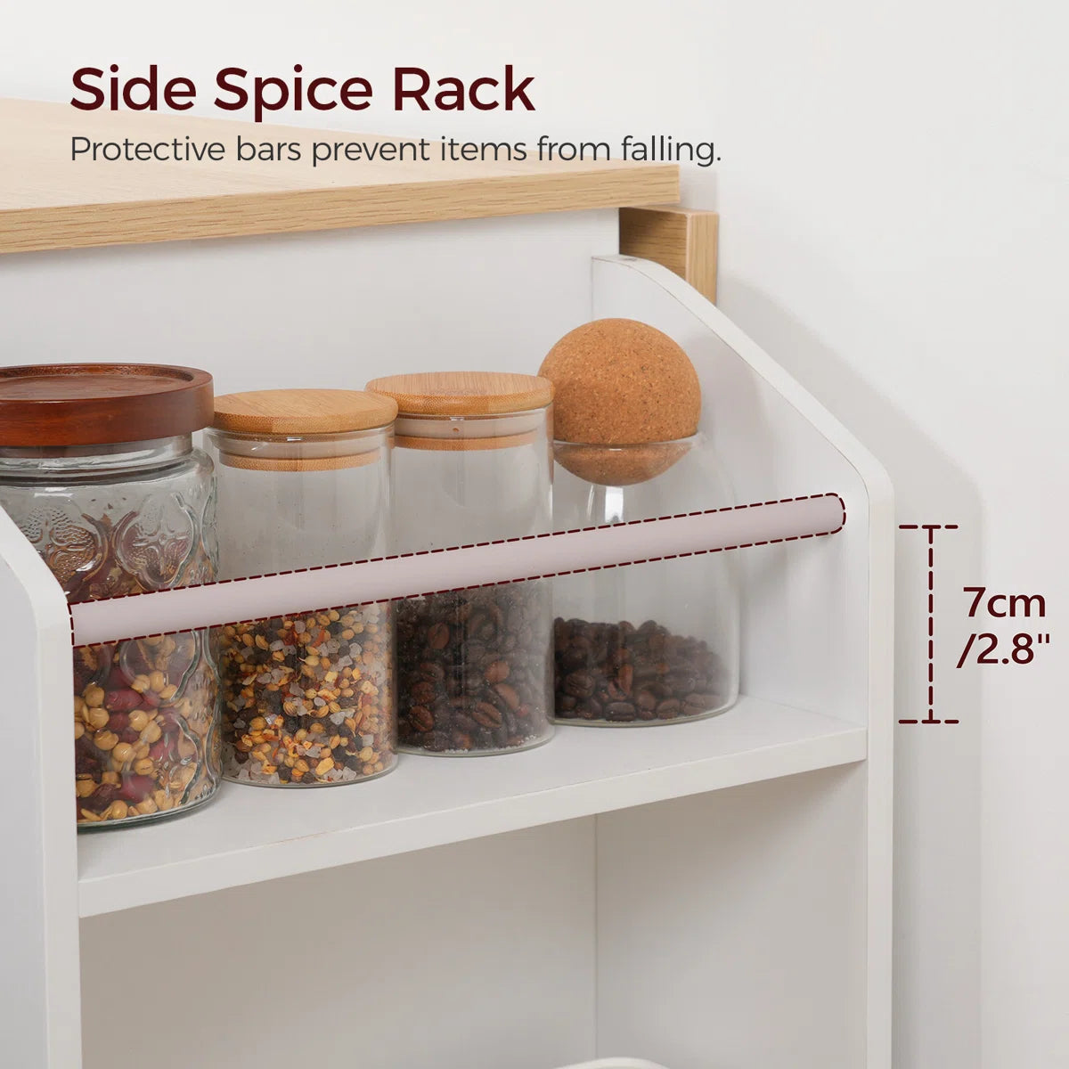 • Includes 2 drawers, a 2-door cabinet, side spice rack, towel bar, and open shelves