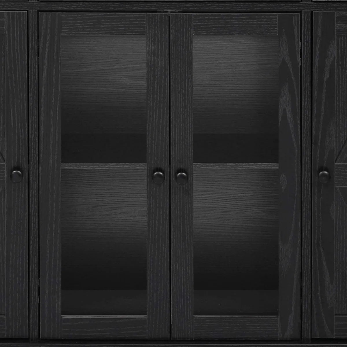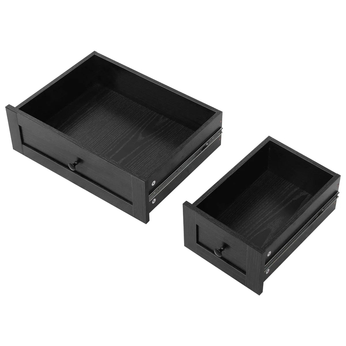 - 3 drawers, 4 cabinets (2 with glass doors), and 5 open side racks.