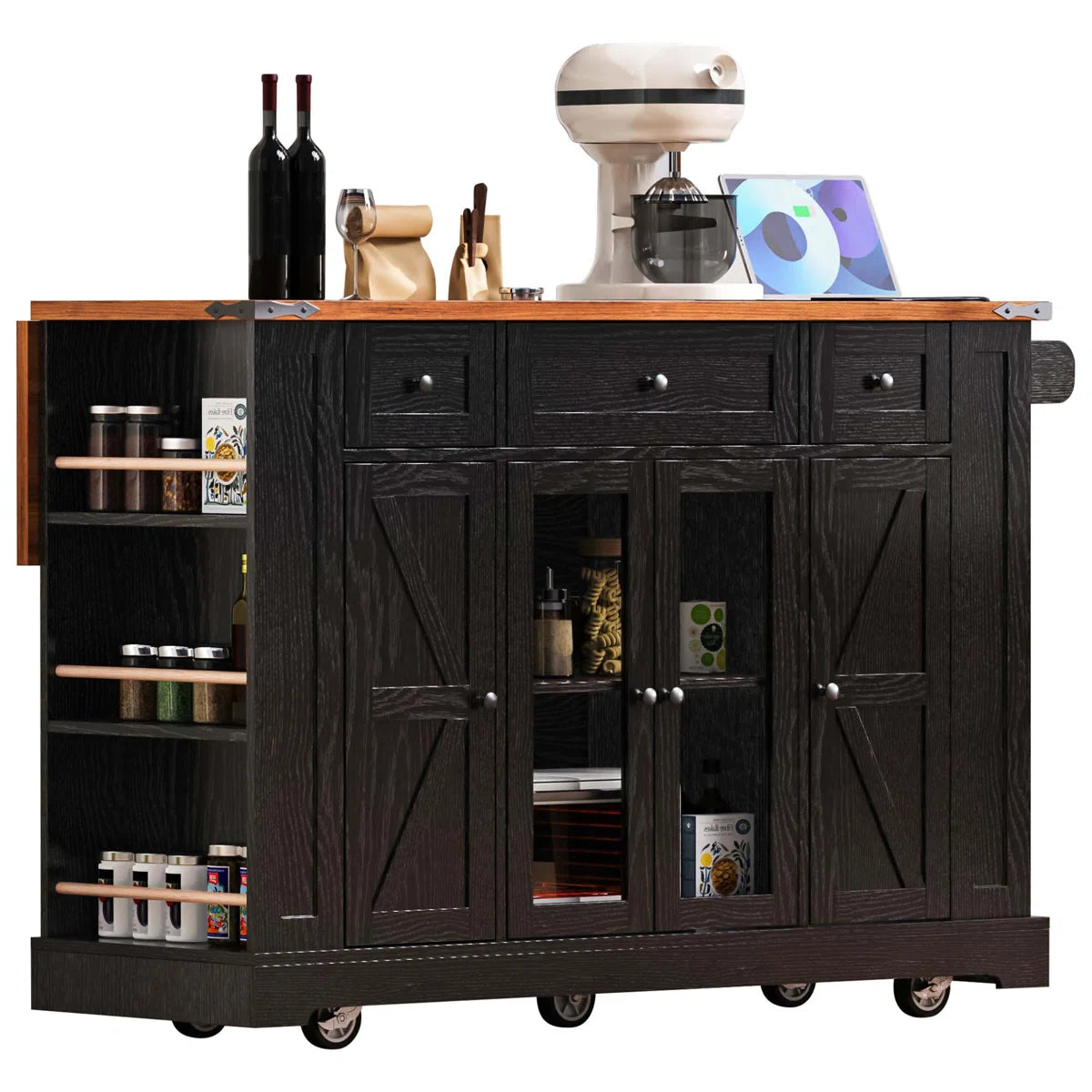 Kitchen Island Table: 53” wide Rolling Cart with Drop Leaf, Power Outlet & Glass Cabinet Doors