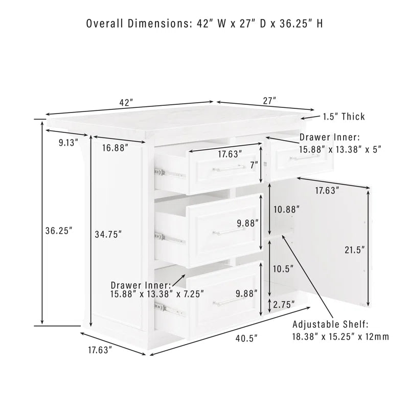 Give your kitchen the luxurious upgrade it deserves with this Cutler Kitchen Island. Designed with a stunning faux marble countertop and elegant beaded moulding, it blends traditional style with practical functionality. With four large drawers and a spacious cabinet with an adjustable shelf, this island helps keep your cookware, utensils, and essentials organised. The extended counter also doubles as a breakfast or prep space. Perfect for Indian homes needing beauty with utility.