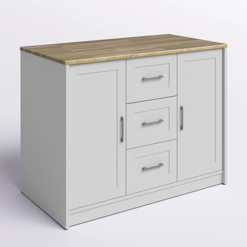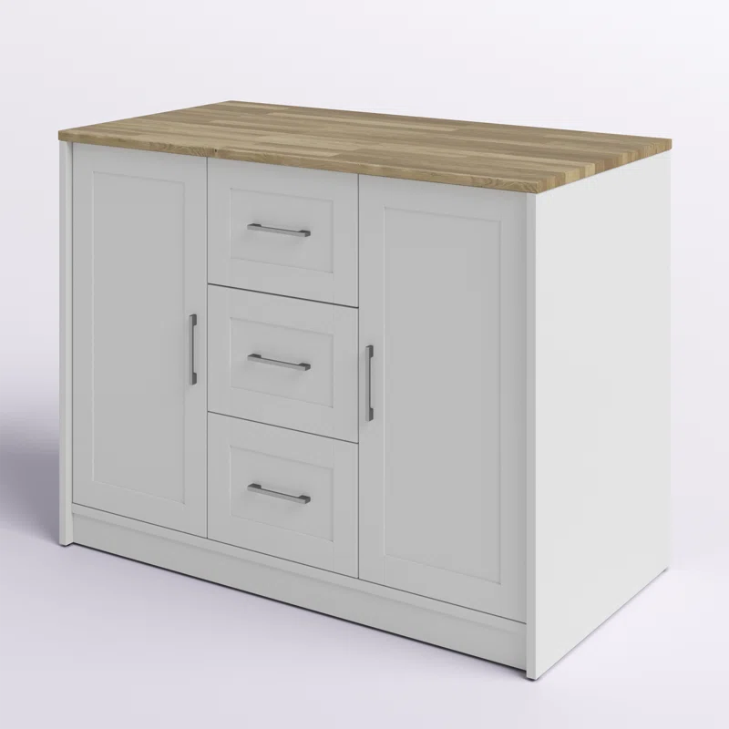 Prepare for weeknight dinners and Sunday brunches with this adaptable kitchen island. It includes two cabinets with moulded panels that open to provide storage for dishes, glassware, or even office essentials, while three drawers offer space for cutlery and linens. The thick butcher block countertop offers generous space for chopping and prepping. Made from a combination of solid and engineered wood in your preferred finish, it stands on a plinth-style base. Chrome-finished metal hardware adds a refined touch. Additionally, the back side of the island is perfect for pairing with your favourite barstools (sold separately).